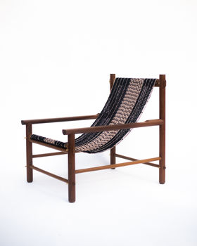 El Sillón Káan incorpora tejido de hamaca en un diseño cómodo y funcional. Esta pieza se puede desmontar para facilitar su transporte y minimizar su huella de carbono. Pequeños pernos de bronce hacen que el montaje y desmontaje sea fácil, al mismo tiempo que proporcionan estabilidad.