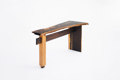 La base de la mesa realza las impresionantes cualidades de esta madera, como los contrastes marcados entre la albura y el duramen. Puede funcionar como escritorio o como mesa auxiliar.