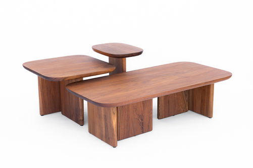 Sencillas en su lenguaje y versátiles en su uso, estas mesas funcionan como una familia donde conviven distintas formas y tamaños, creando un diálogo de proporciones. Su diseño sobrio les permite integrarse con naturalidad a cualquier espacio, mientras que sus líneas finas y cuidadas resaltan la belleza auténtica de las maderas tropicales. Al combinarse, crean geometrías cambiantes: un juego de vacíos y volúmenes que generan sombras, ritmos y nuevas lecturas desde distintos ángulos.